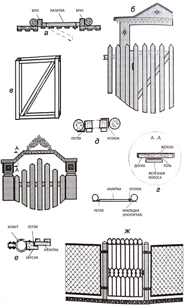 Обвязку (раму) калитки делают на шипах и обязательно ставят раскос (рис. 7в). Петли крепят на шурупах, желательно оцинкованных. Затем к обвязке прибивают штакетник, закрепляют ручки и замок.