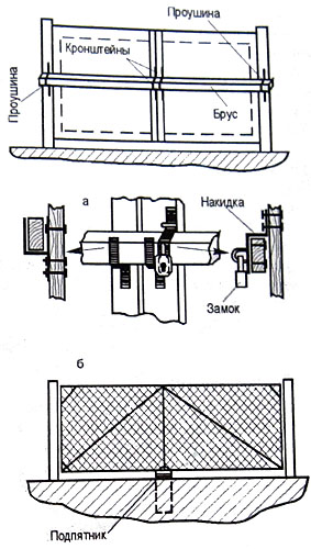 Ворота навешивают на столбы с помощью специальных петель для ворот. Ставят их с внутренней стороны, при этом ворота открываются в сторону участка. Для запирания ворот лучше применять устройство (рис. 8а), где главной частью служит брус сечением 40x80 мм.